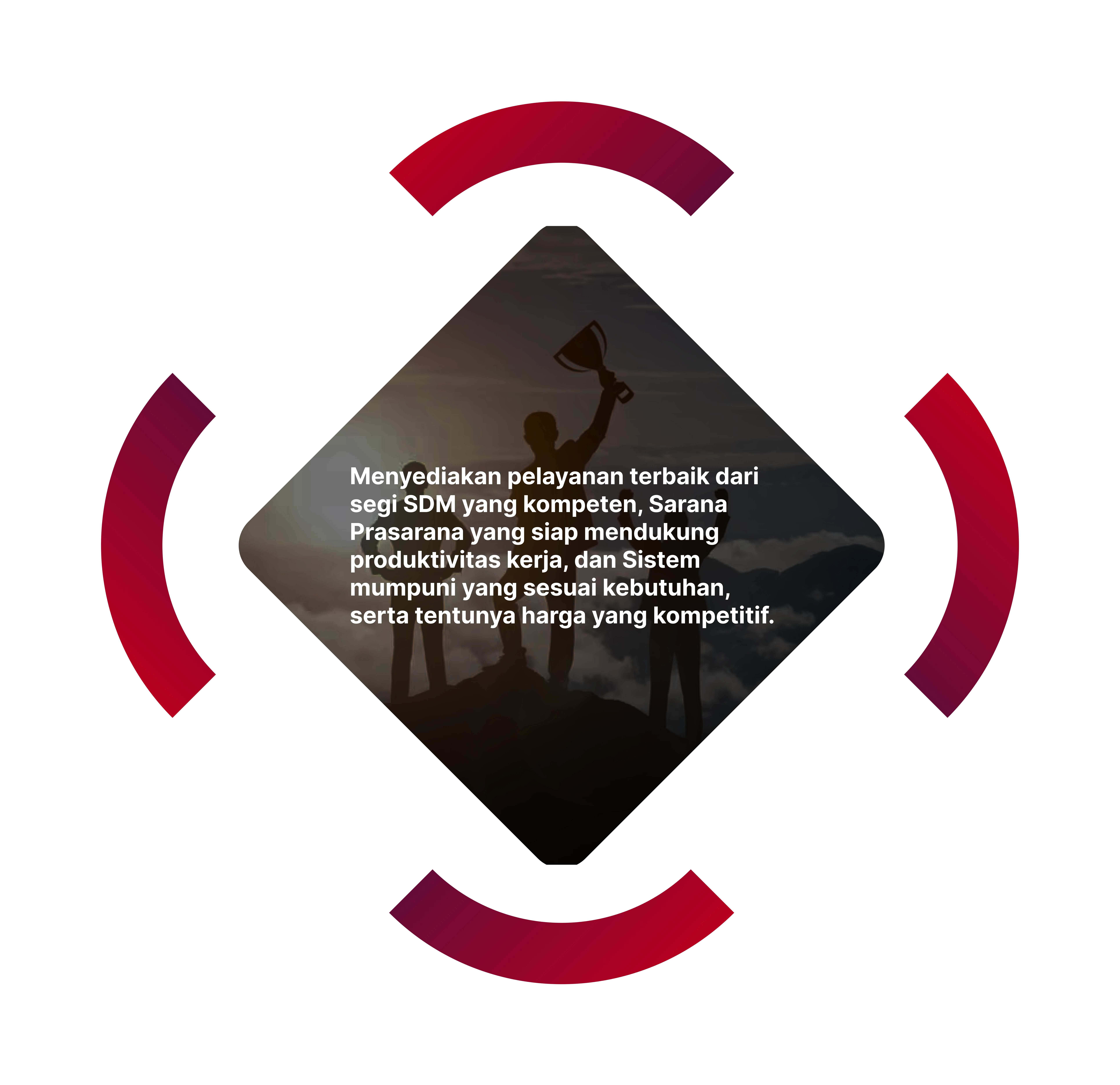 Menyediakan pelayanan terbaik dari segi SDM yang kompeten, Sarana Prasarana yang siap mendukung produktivitas kerja, dan Sistem mumpuni yang sesuai kebutuhan, serta tentunya harga yang kompetitif.